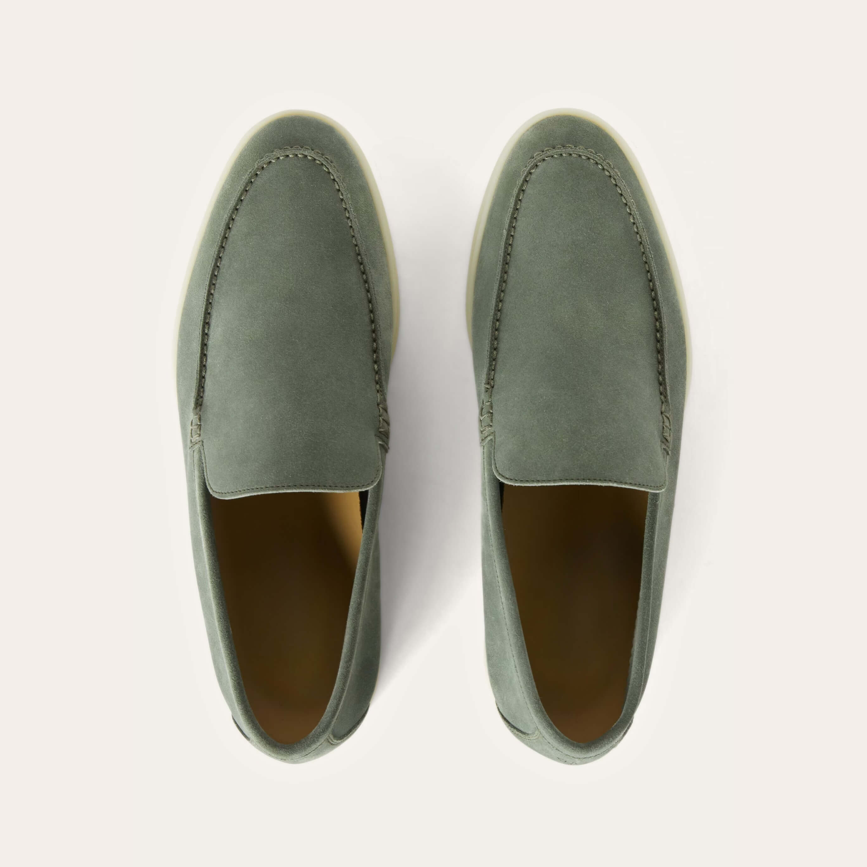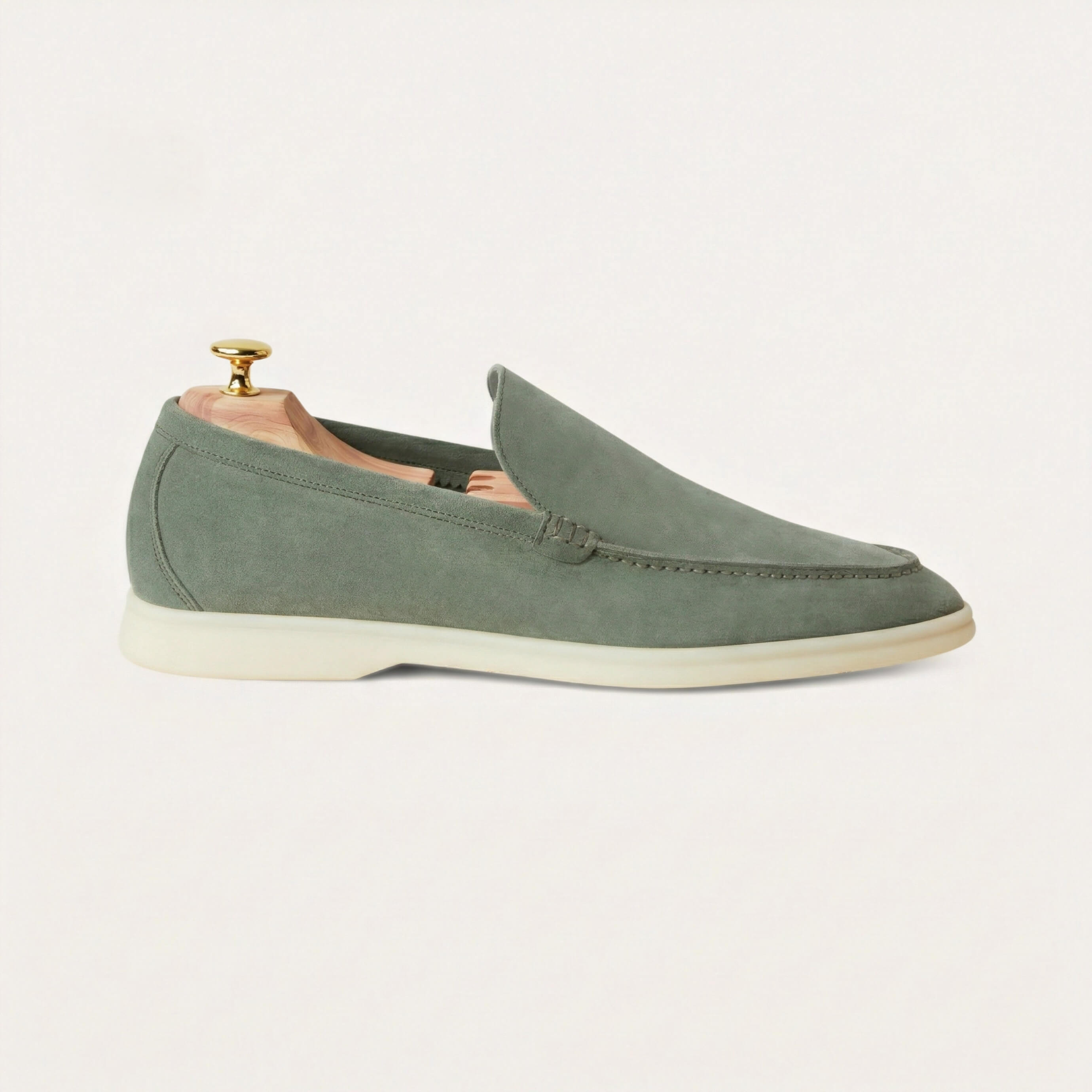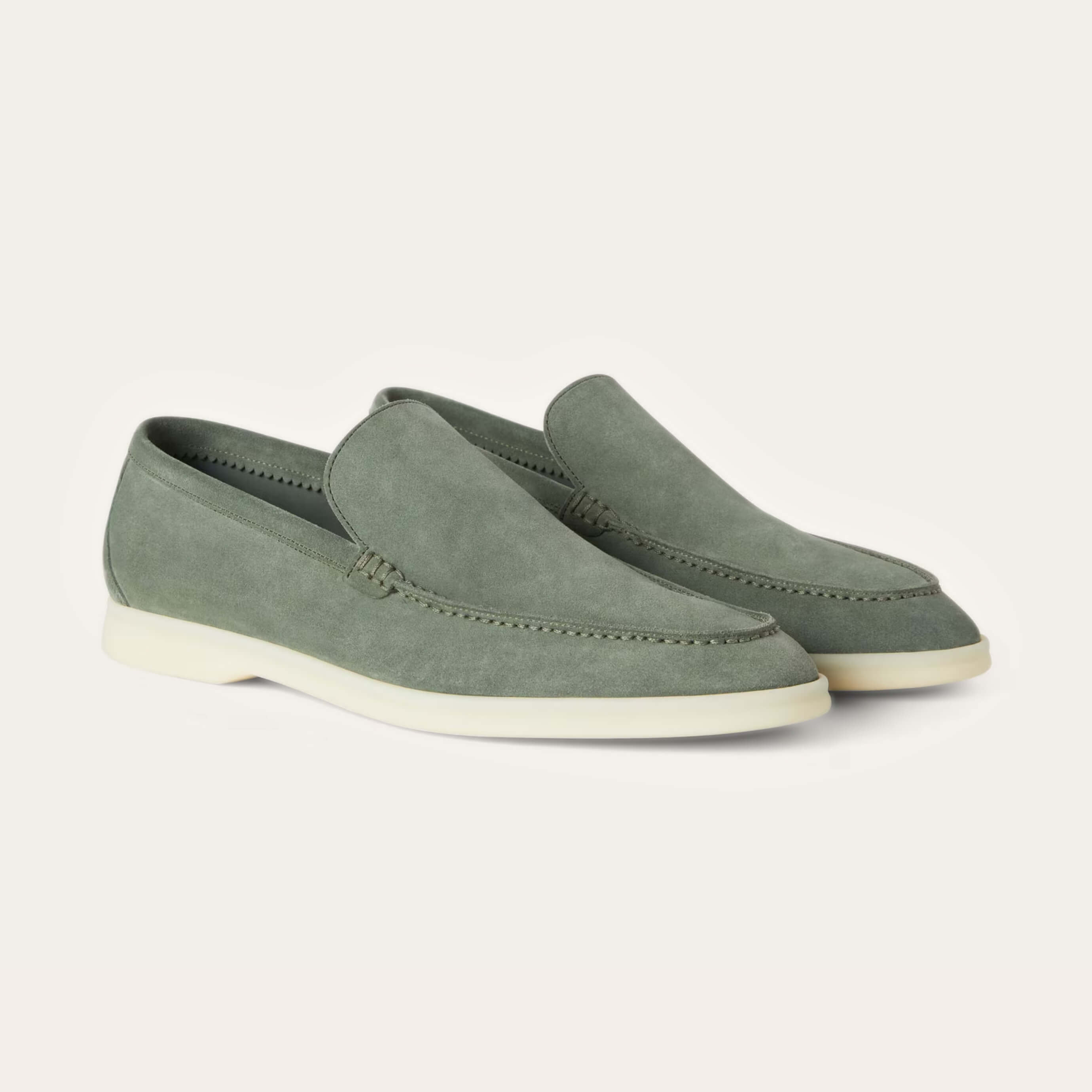 Cut from premium suede and left unlined for enhanced softness and breathability, they mold effortlessly to the foot with wear. The lightweight rubber sole ensures all-day comfort, while the hand-stitched apron and side seams reflect a quiet mastery of detail. Designed for warm-weather ease, they transition seamlessly from resort paths to city streets, with or without socks.