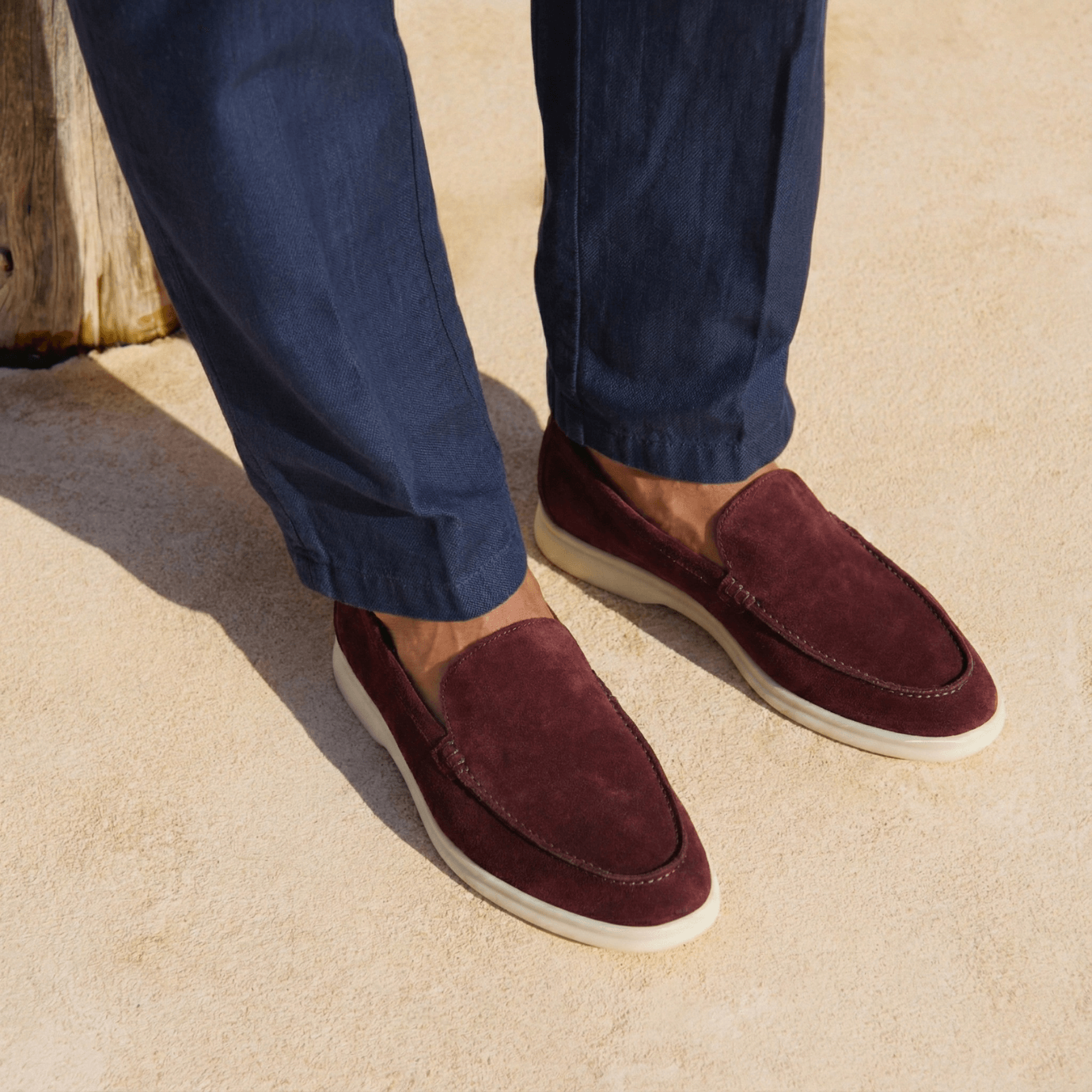 Cut from premium suede and left unlined for enhanced softness and breathability, they mold effortlessly to the foot with wear. The lightweight rubber sole ensures all-day comfort, while the hand-stitched apron and side seams reflect a quiet mastery of detail. Designed for warm-weather ease, they transition seamlessly from resort paths to city streets, with or without socks.