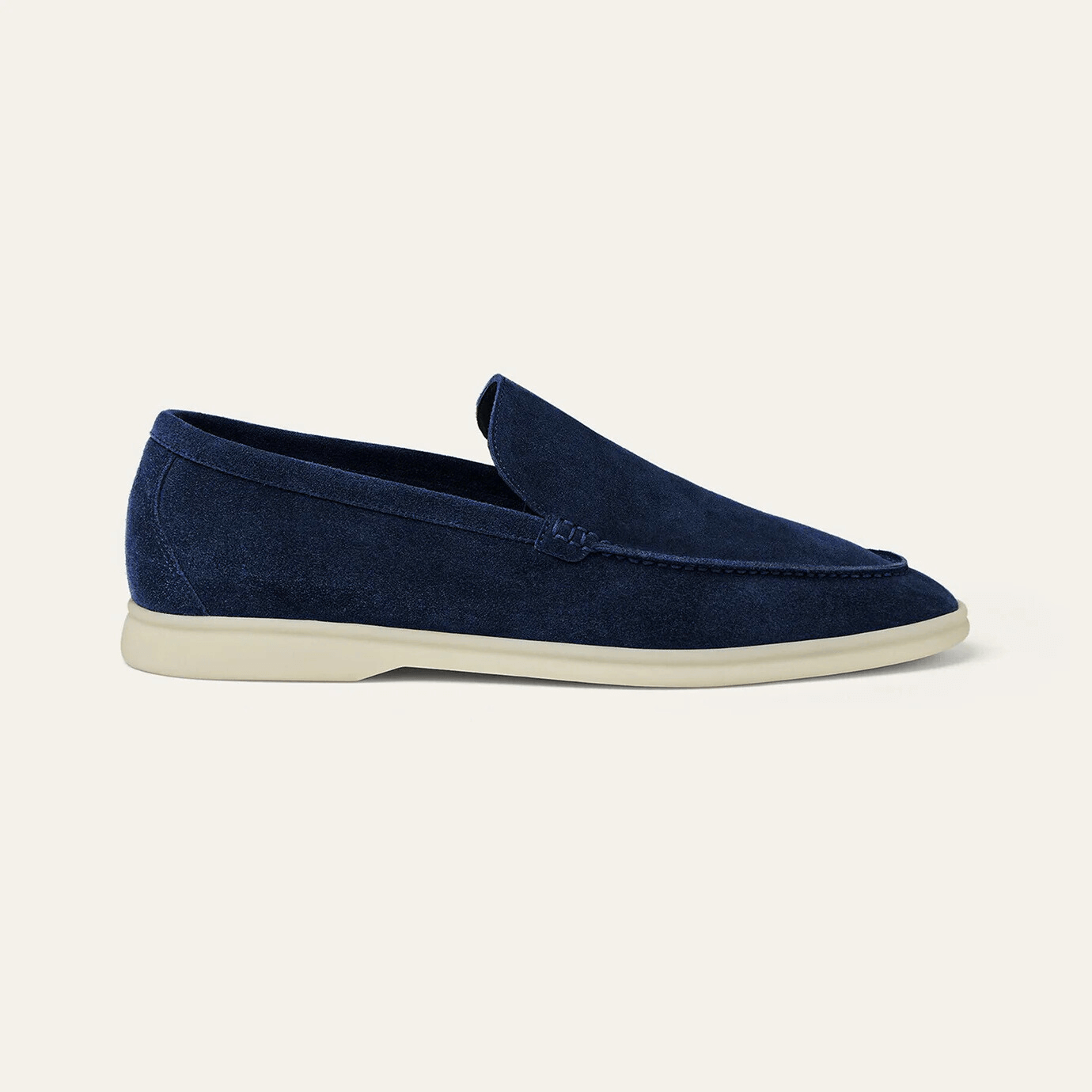 Cut from premium suede and left unlined for enhanced softness and breathability, they mold effortlessly to the foot with wear. The lightweight rubber sole ensures all-day comfort, while the hand-stitched apron and side seams reflect a quiet mastery of detail. Designed for warm-weather ease, they transition seamlessly from resort paths to city streets, with or without socks.