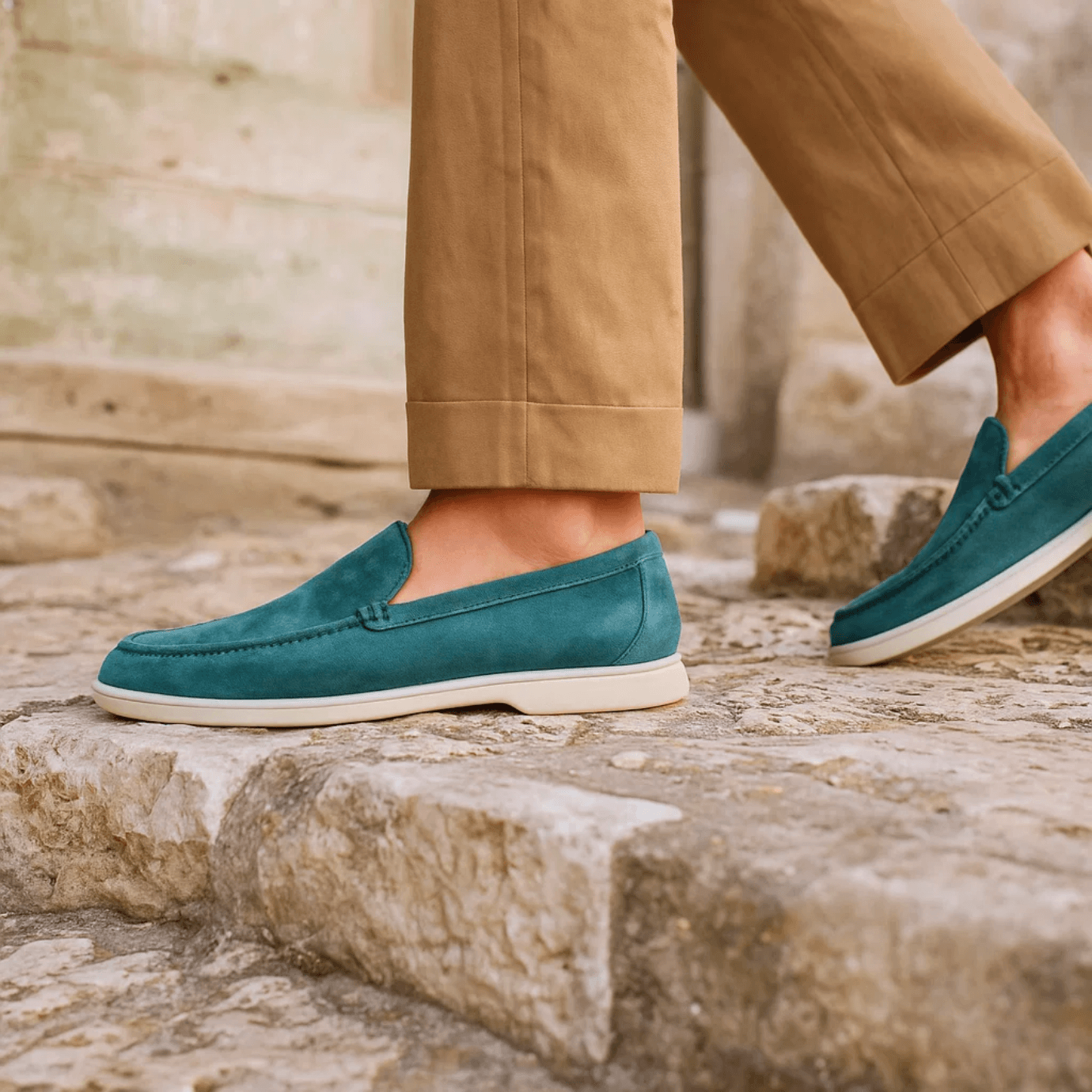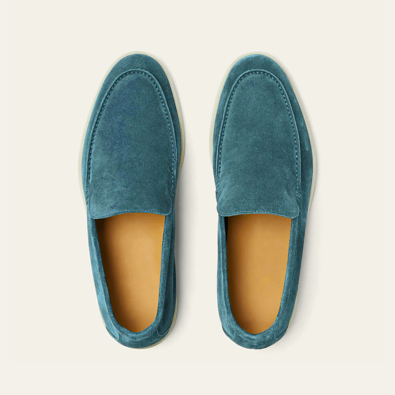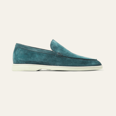 Cut from premium suede and left unlined for enhanced softness and breathability, they mold effortlessly to the foot with wear. The lightweight rubber sole ensures all-day comfort, while the hand-stitched apron and side seams reflect a quiet mastery of detail. Designed for warm-weather ease, they transition seamlessly from resort paths to city streets, with or without socks.